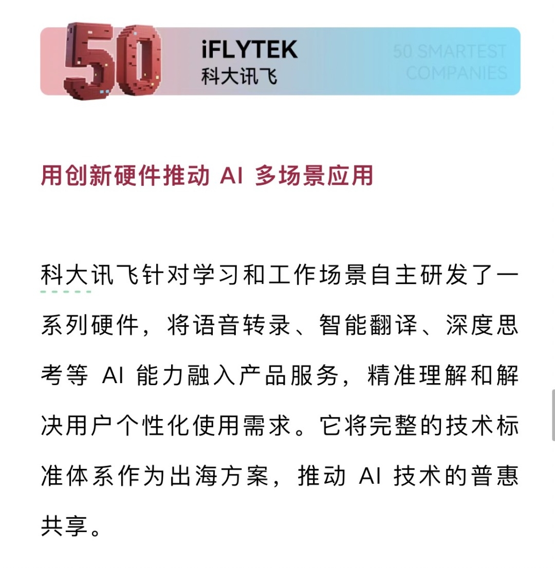 9月,《麻省理工科技评论》在其年度“50家聪明公司”榜单中,再次出现了科大讯飞的名字。这是科大讯飞第三次入选了。上榜理由“用创新硬件推动AI多场景应用,同时通过出海推动AI技术普惠共享”。