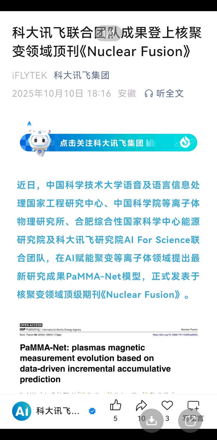 $科大讯飞(SZ002230)$ 科大讯飞联合团队成果登上核聚变领域顶刊《Nuclear Fusion》