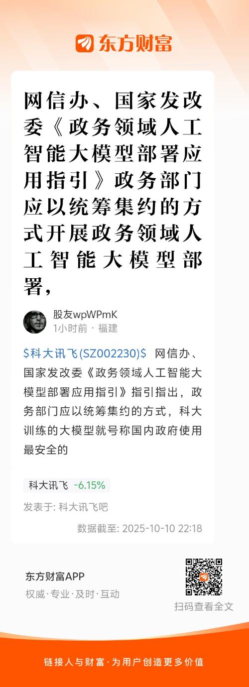 $科大讯飞(SZ002230)$ 网信办、国家发改委《政务领域人工智能大模型部署应用指引》指引指出,政务部门应以统筹集约的方式,科大训练的大模型就号称国内政府使用最安全的