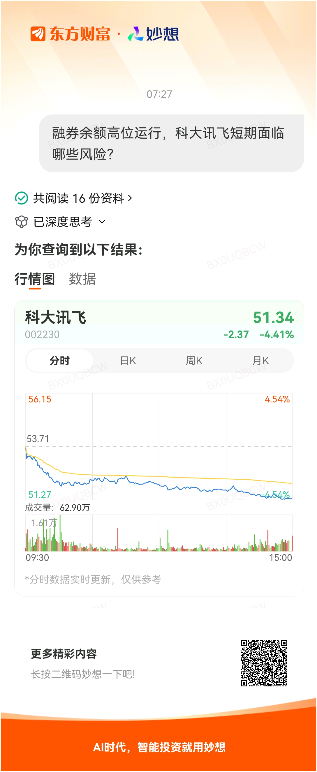 #@妙想,你怎么看?# 妙想一下:融券余额高位运行,科大讯飞短期面临哪些风险?融资机构带头抛售?