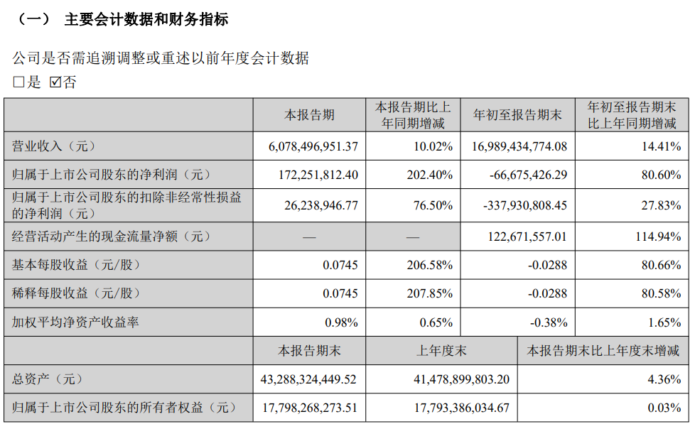 值得注意的是,第三季度,公司营业收入、归母净利润、扣非净利润、经营性现金流等各项核心经营指标均保持正向增长,且第三季度当季度净利润、现金流均实现转正。具体而言,公司营业收入为60.8亿元,同比上升10.0%;归母净利润为1.72亿元,同比上升202.4%;扣非归母净利润为2624万元,同比上升76.50%;经营性现金流净额 8.95 亿元,同比增长 25.19%。