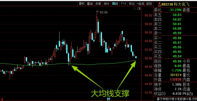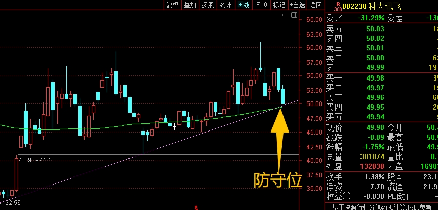 $科大讯飞(SZ002230)$ 周线来看这里基本回落到了趋势线和大均线49.37位置的支撑,可以跌破但不能有效跌破,叠加日线脚底的大均线49.48位置,这个小区域需要重点关注,能支撑住都好说,可以继续观察,但有效跌破就要大幅减仓应对破位风险了,不要纠结,能走稳了再考虑买回对应仓位。