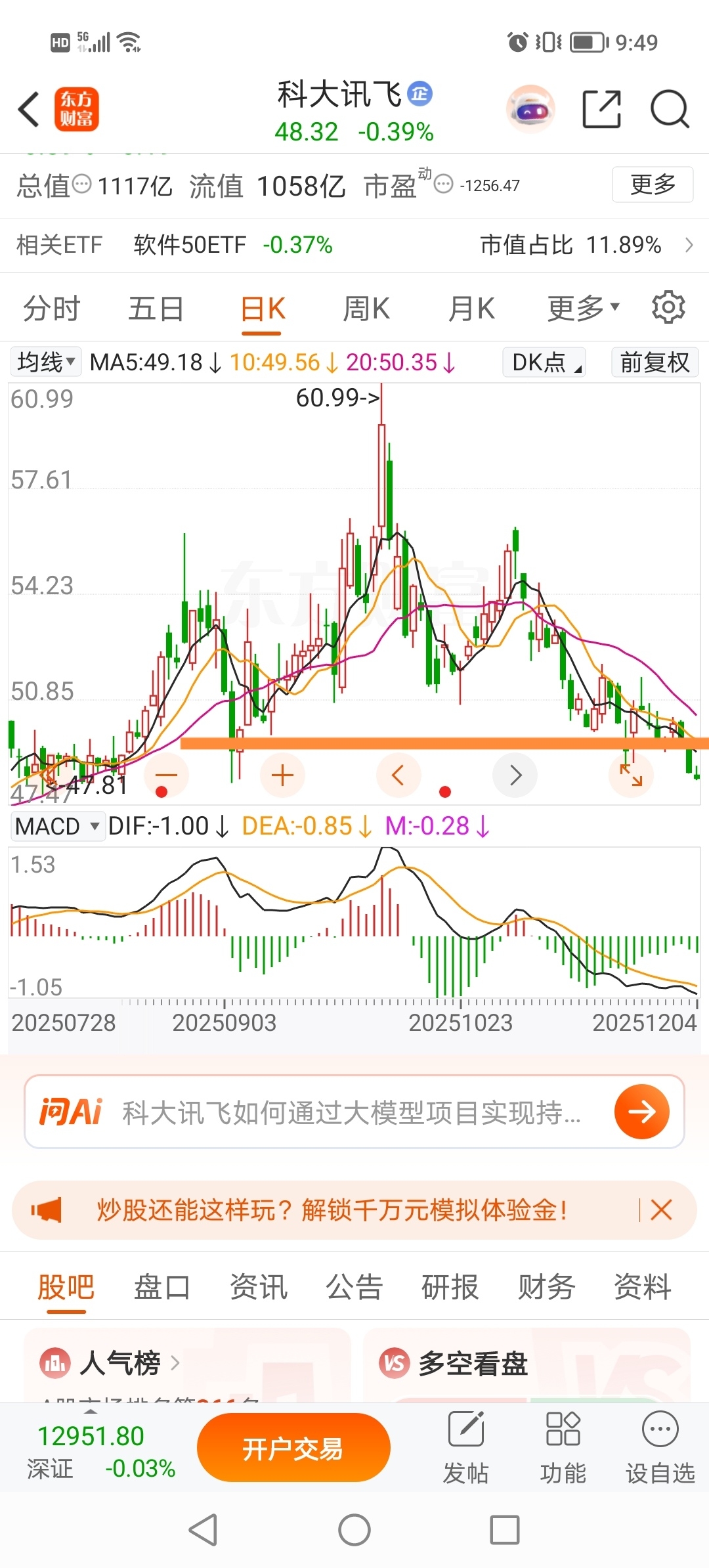 $科大讯飞(SZ002230)$ 不破不立,这一说不过是把50这心理防线突破了,其实还得真具备继续做空的头寸和客观利空要素,至于头寸看大股东愿不愿意,而客观利空要素不具备。应该是下跌有限。