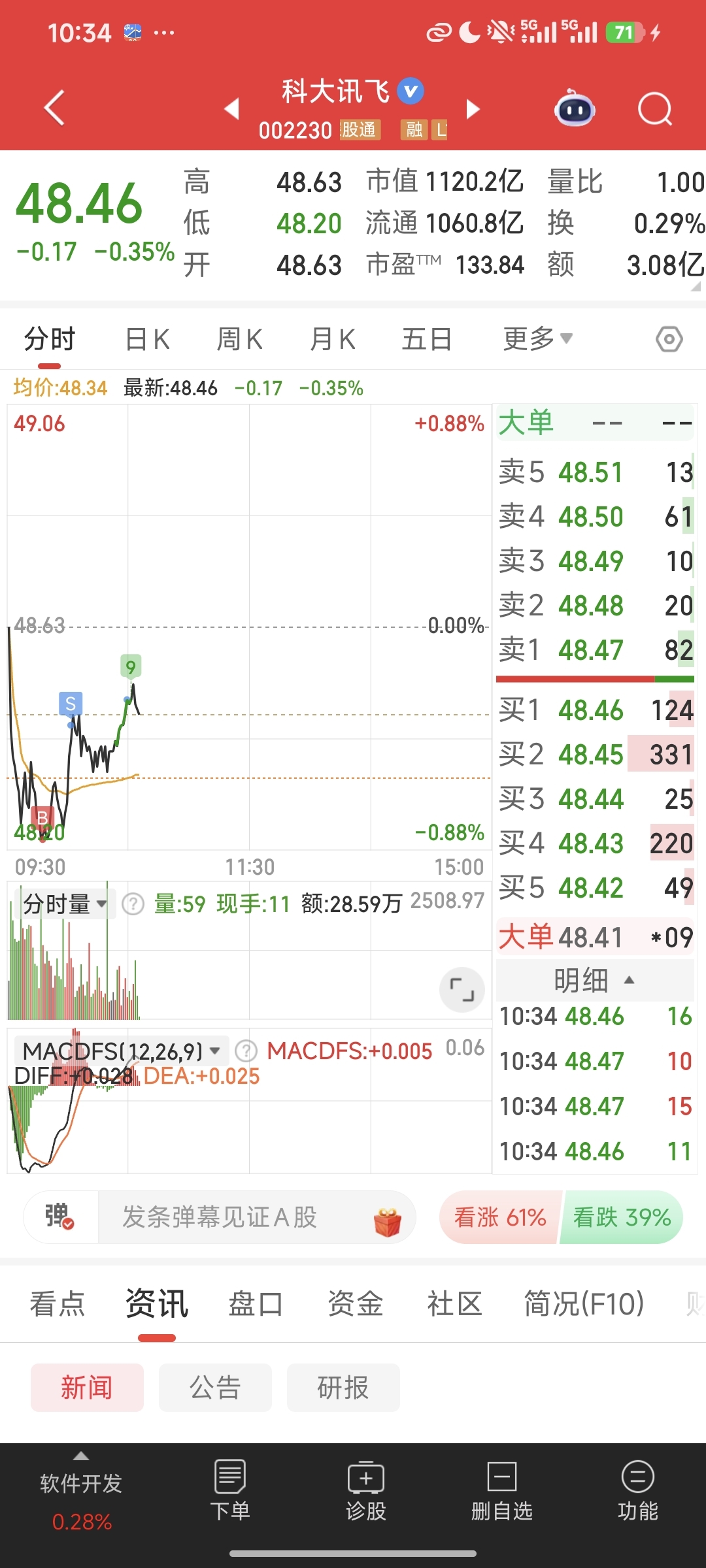 $科大讯飞(SZ002230)$ 没量太弱了走了