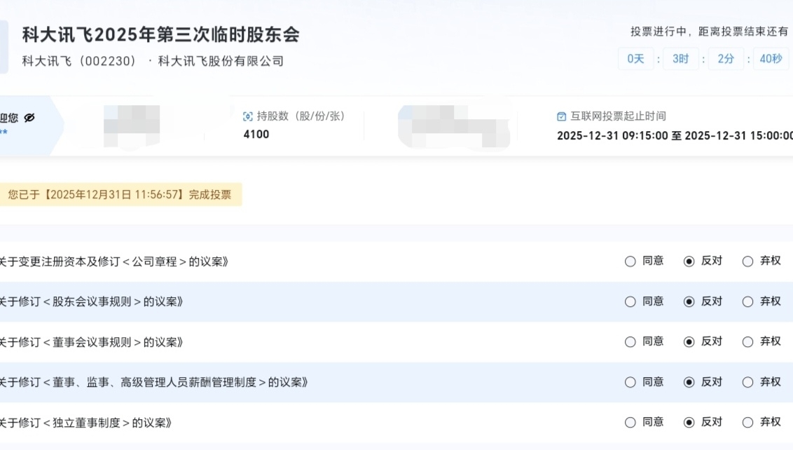 $科大讯飞(SZ002230)$ 今日必投反对票,截图为证!!!