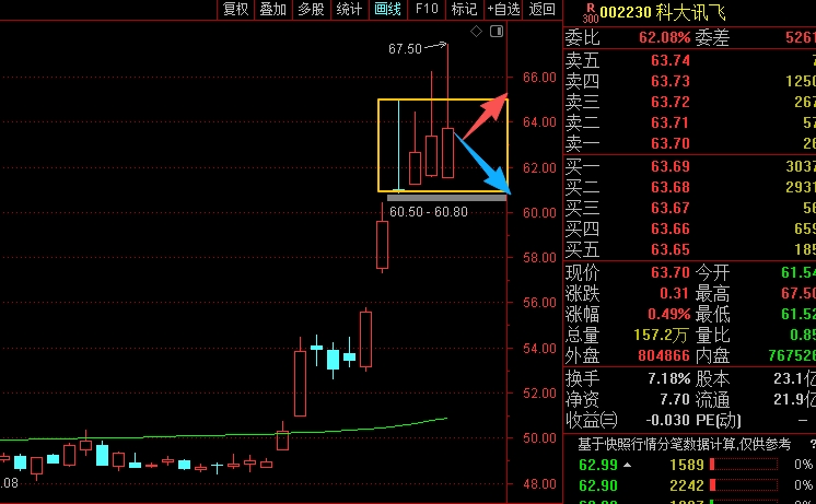 $科大讯飞(SZ002230)$ 近期大幅拉升起来,整体趋势还不错,不过短线这几天主要是高位做个盘整的动作,走出了一个小箱体,接下来重点就需要盯着箱体的得失吧,能继续突破站稳就没问题,继续震荡看涨,但如果突破未遂,回落下来,就要注意短期的调整了,特别是箱体底部需要重点盯着额,有效跌破就需要大幅减仓应对,防着破位后的连续下杀风险。#炒股日记# #周度策略#