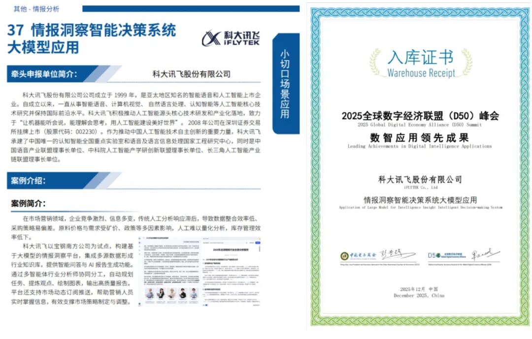 近期,科大讯飞“星火行业分析师”连获两项重要认可:被国家工业信息安全发展研究中心认定为“垂直大模型典型应用案例”,并获评2025全球数字经济联盟(D50)峰会“数智应用领先成果”。这不仅是对产品方案的认可,更标志着国产行业大模型在赋能实体经济、驱动产业转型的道路上,已具备了“安全好用”的硬实力。