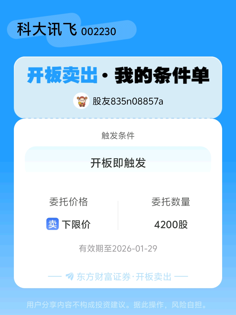 #条件单交流# #开板卖出晒单# 一位股神设置了一个开板卖出条件单,接下来就是见证奇迹的时刻~$科大讯飞(SZ002230)$