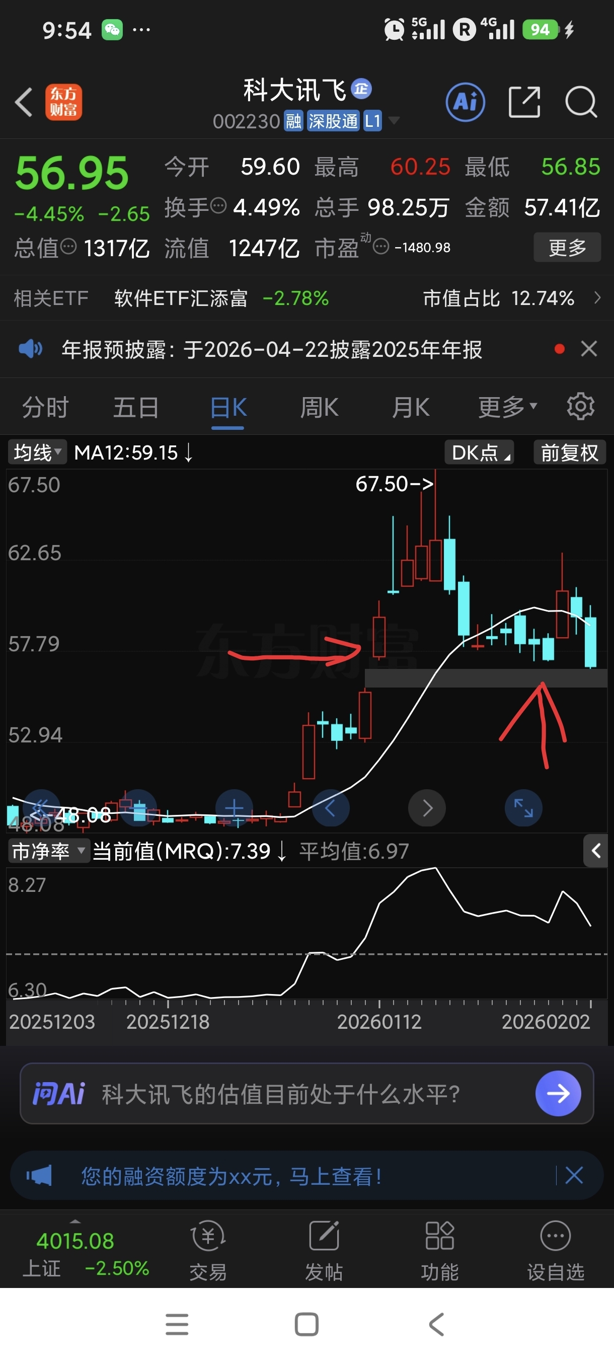 $科大讯飞(SZ002230)$ 突破平台的日线底部57.30元是千万不能破的,哪怕破一分钱都不行,回调时连续两天跌破。再上涨时就是让大家跑路的,我就是那天涨停的时候跑的。