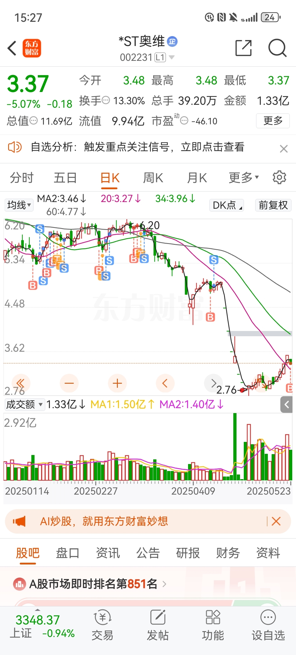 $*ST奥维(SZ002231)$ 4月17号4.90抛光,今天平均3.39买回。仓位奥维8成,美晨2成,敢买就不怕。