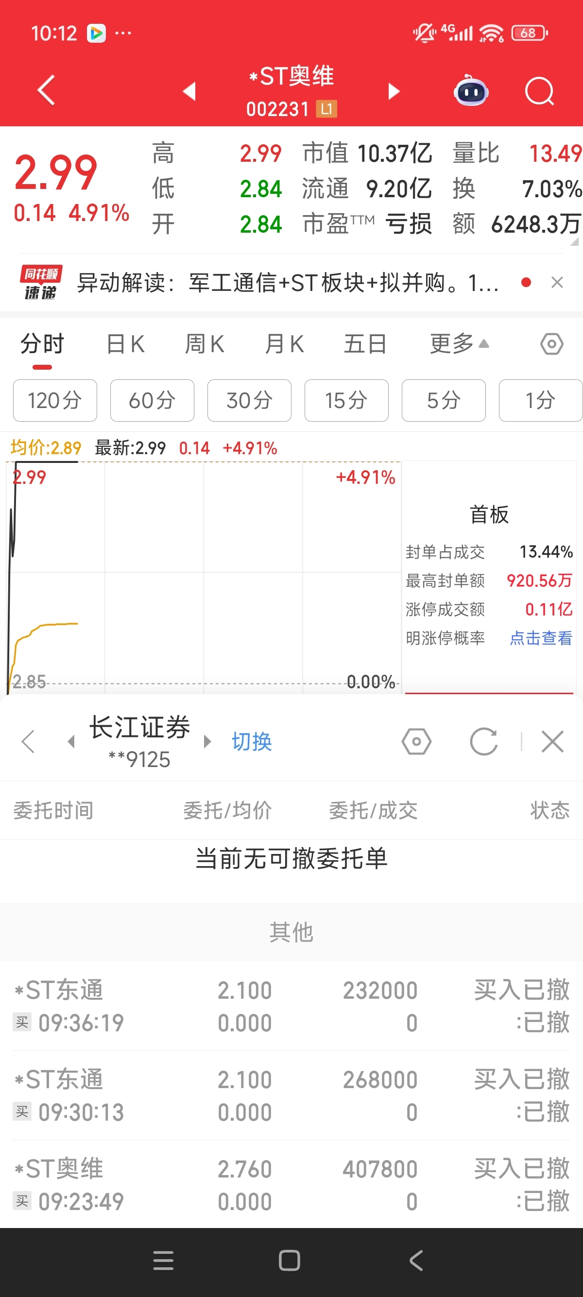 $*ST奥维(SZ002231)$ 集合竞价挂低了。我主动翘的,结果自己没有进去。