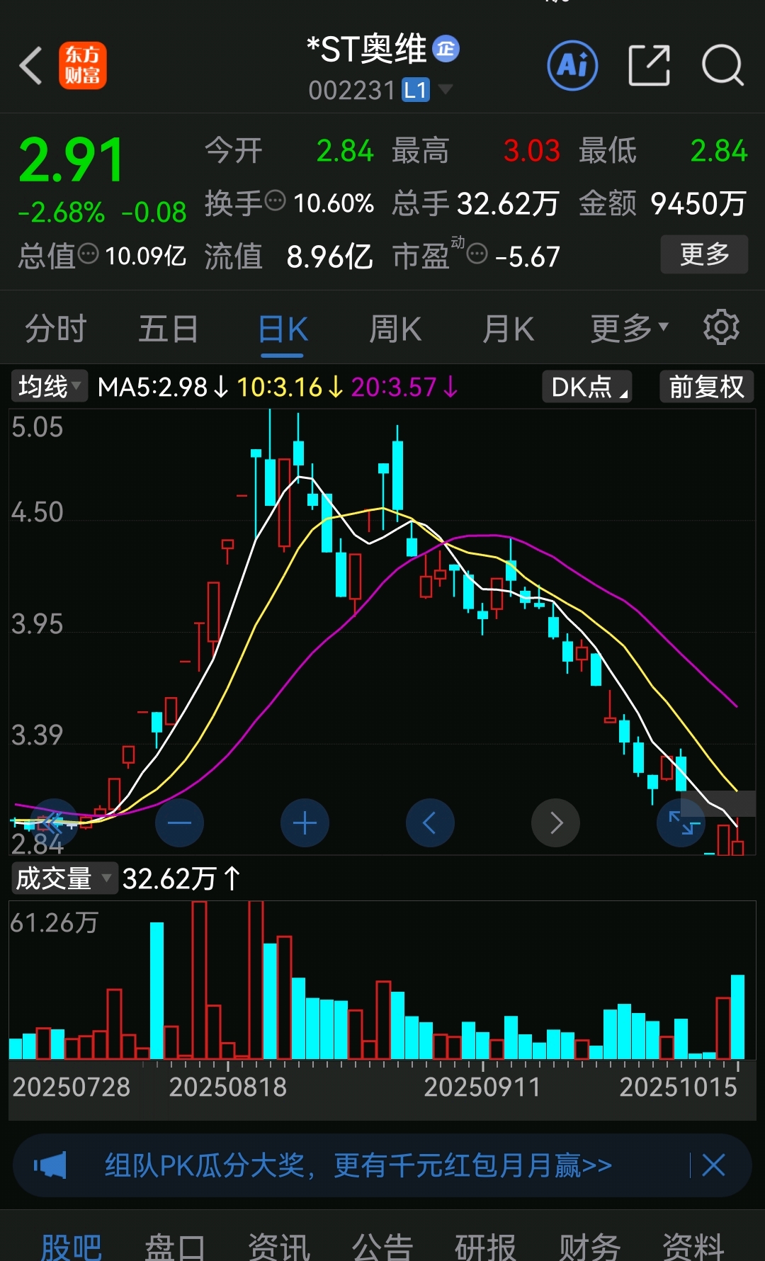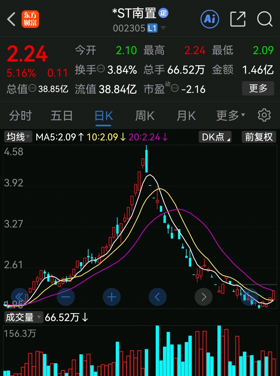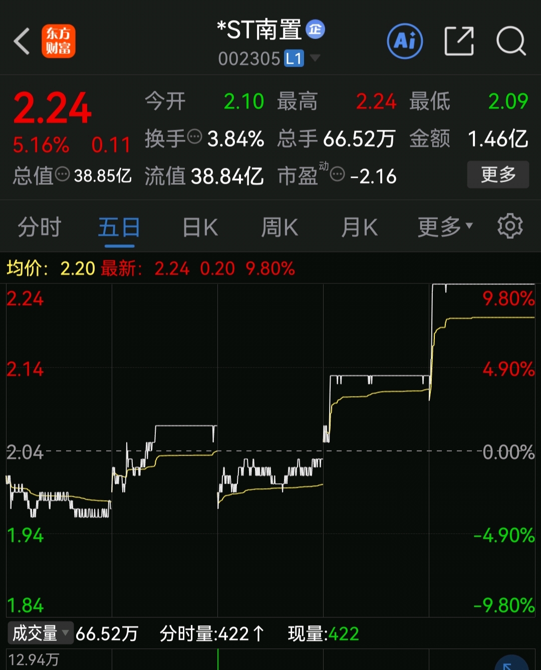 走势和*ST南置很像的。第一天涨停后,跟着调整一天。第三,第四天。又连续涨停了。都是调整下来的ST。*ST南置已经两连板了。奥维通信是没退市的ST,200多家里面市值最小的一个公司了。