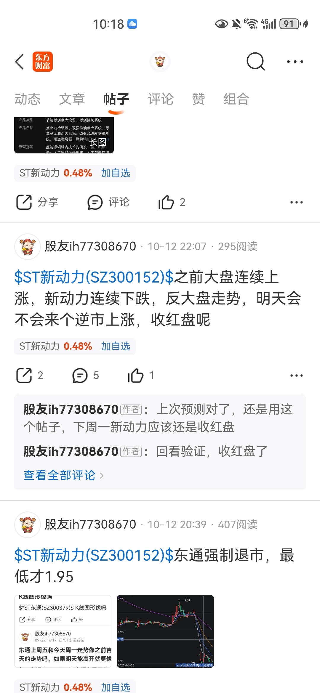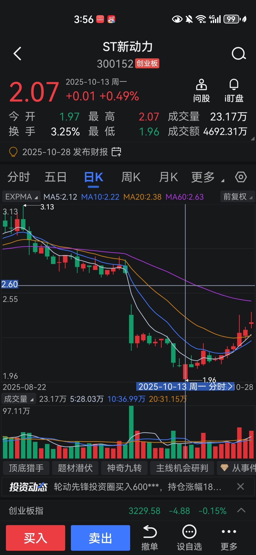 $*ST奥维(SZ002231)$ 今天奥维吧里看空恐慌的人特别多,又想起10月12号那天在新动力发帖的时候,那天一堆人说13号要跌停,但是本人还是觉得有可能收红盘,回看13号那天是收的红盘,而且如果早盘克服恐慌跟上一起买入的是不是买到了近期最低点了