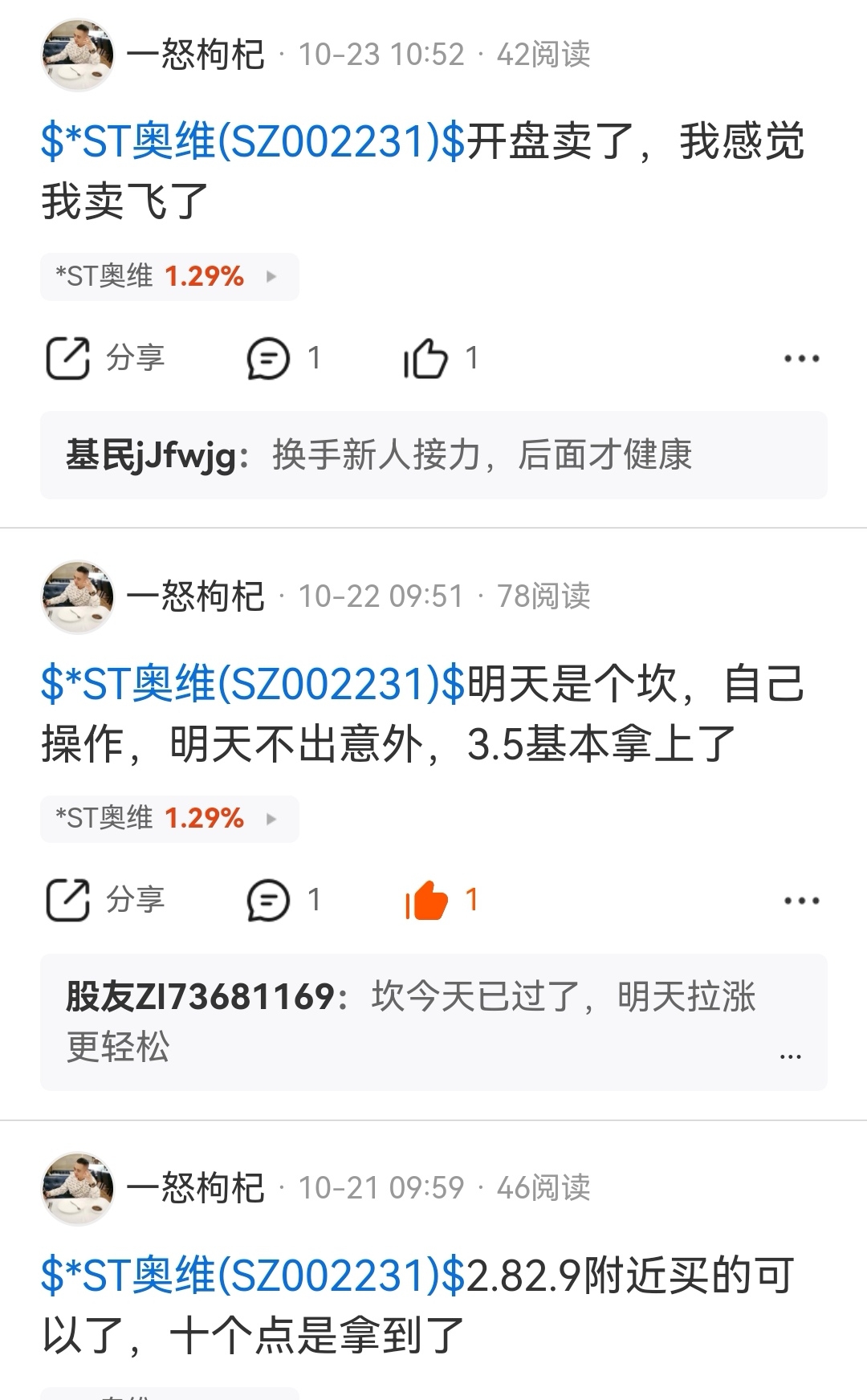 $*ST奥维(SZ002231)$ 跌多少跟我有啥关系,3.54早卖了,没卖到最高,也没买到最低,一群山炮