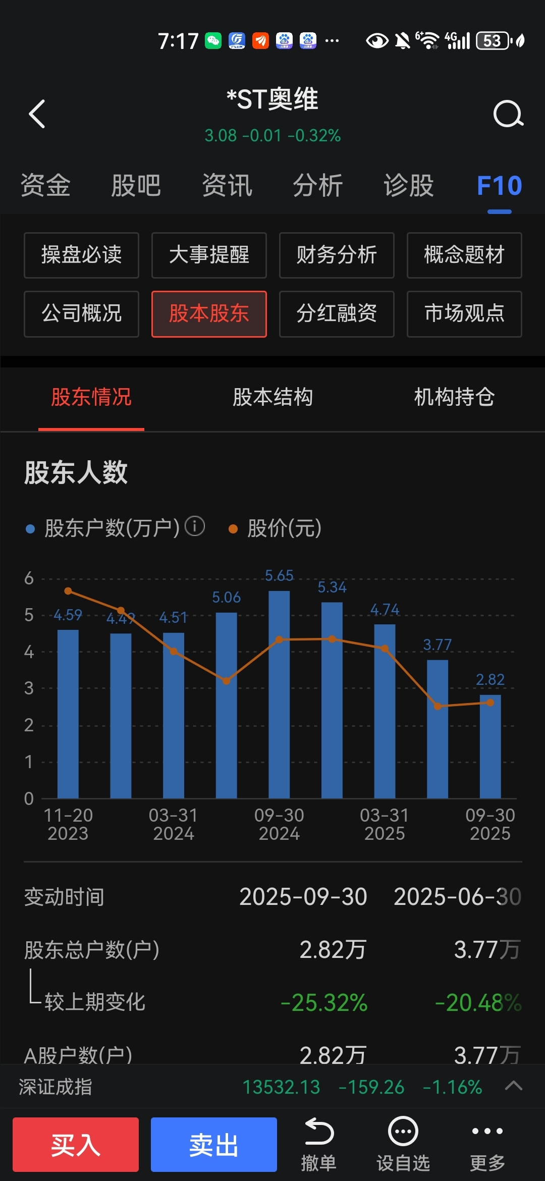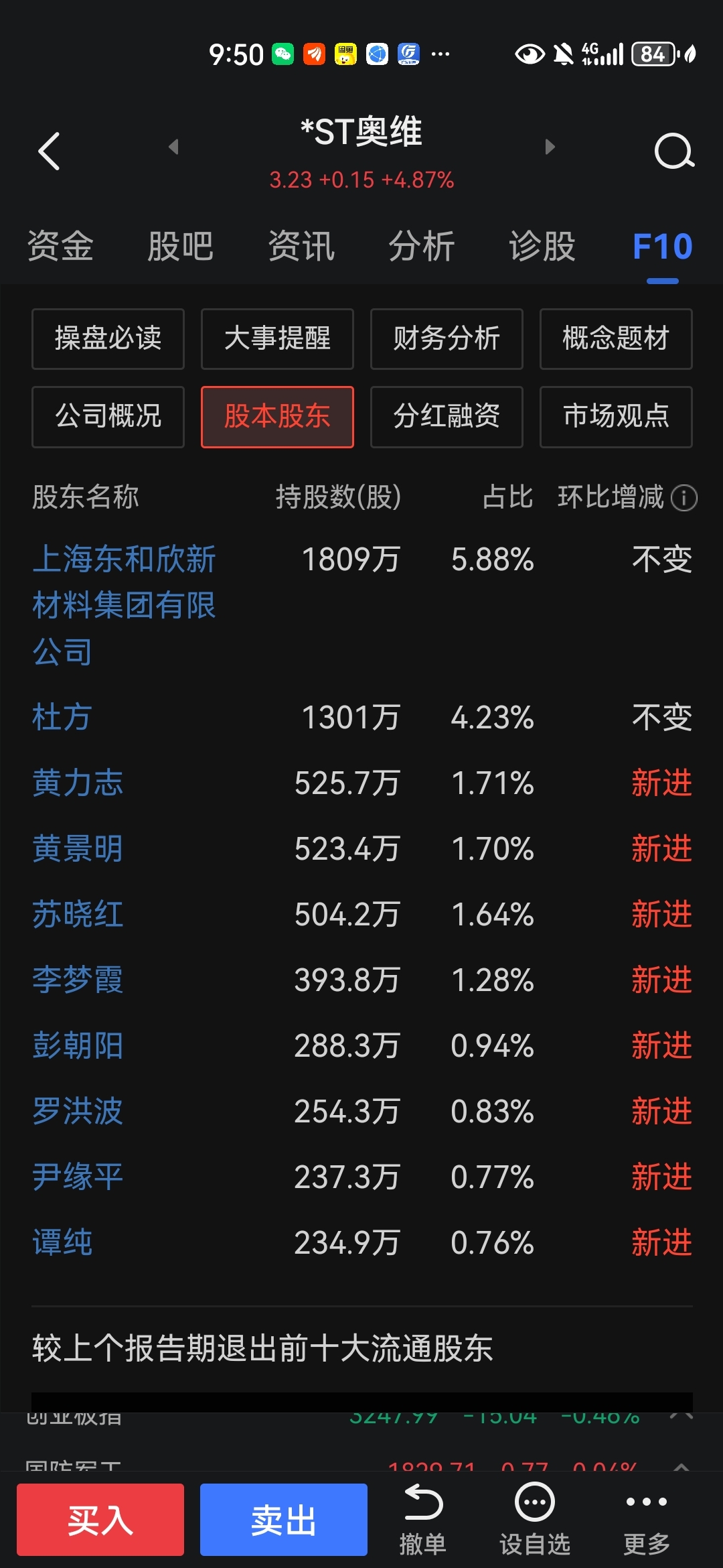 $*ST奥维(SZ002231)$ 不仅股东人数大幅度下降,还进了很多资金,全是机构净买入,我早上还临时分享新规律,就是担心因为昨天晚上全是看空的,今天有人出了,之前介入过新元,沐邦,新动力,感觉在奥维的发帖是最累的