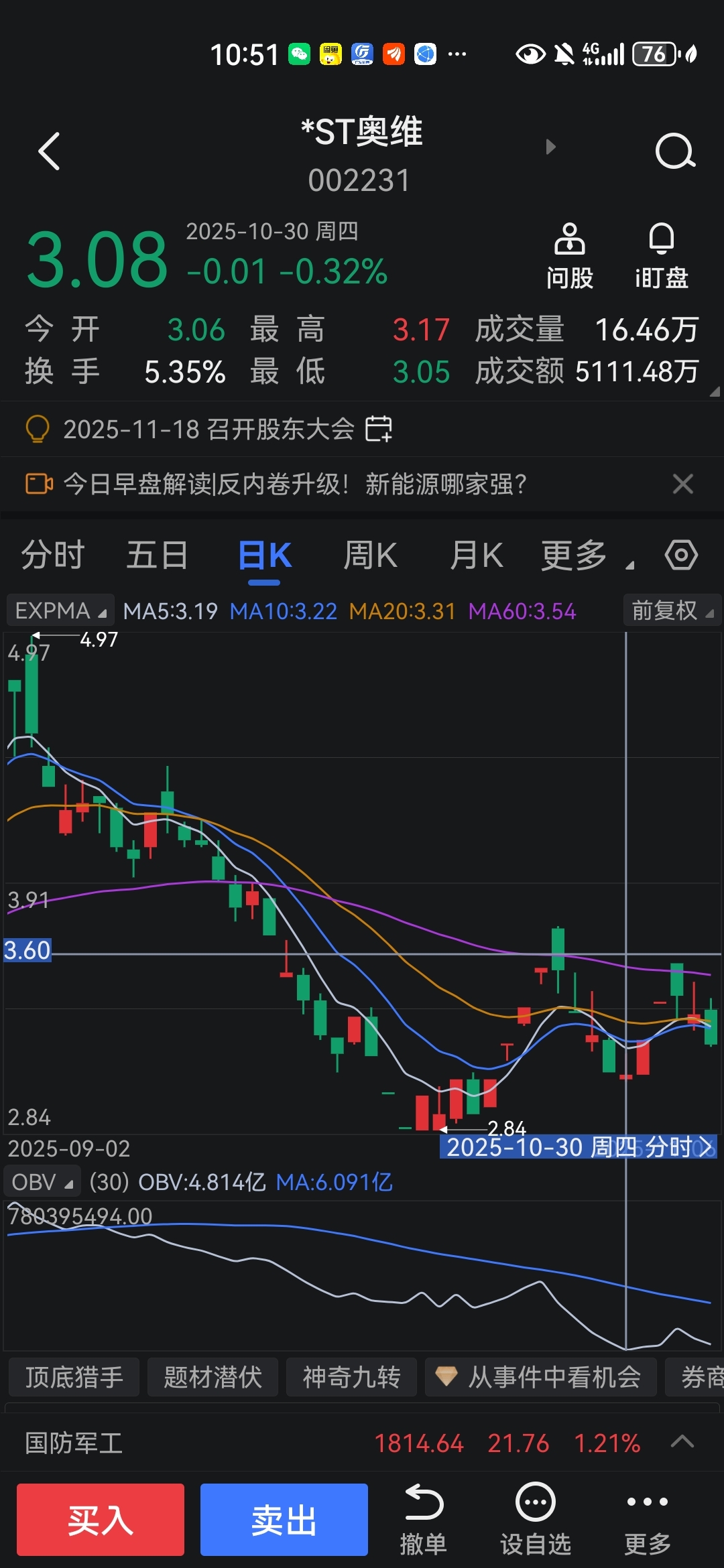 $*ST奥维(SZ002231)$ 回看10月30号左边两个交易日的图形,再看看今天和昨天的图形,今天是卖点吗,知道为什么很多人觉得一卖就涨,本来就不是卖点,非要坚持卖了