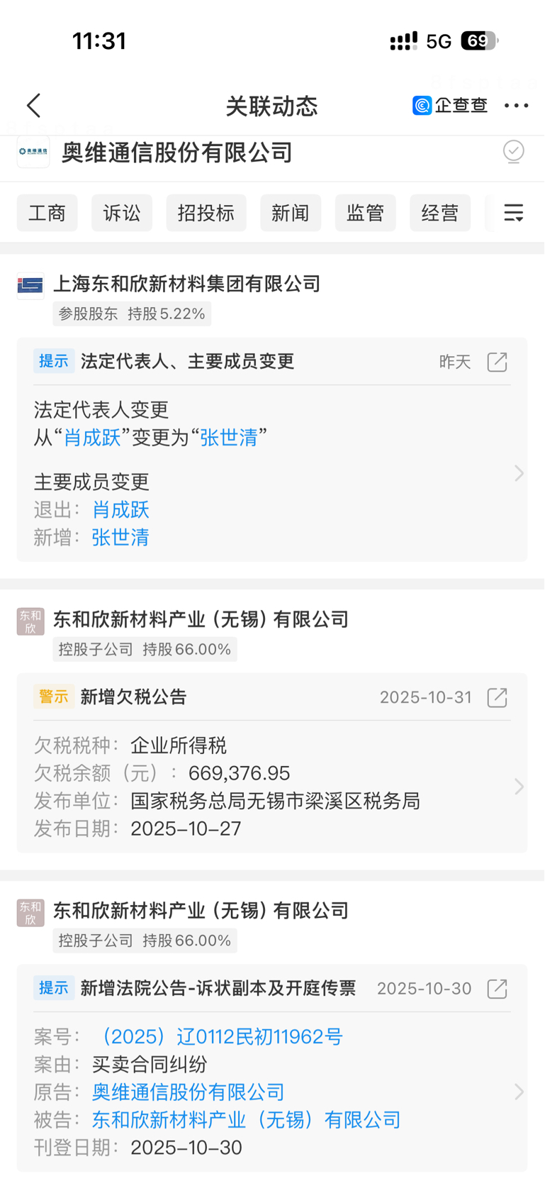 $*ST奥维(SZ002231)$ 法人变更、奥维起诉