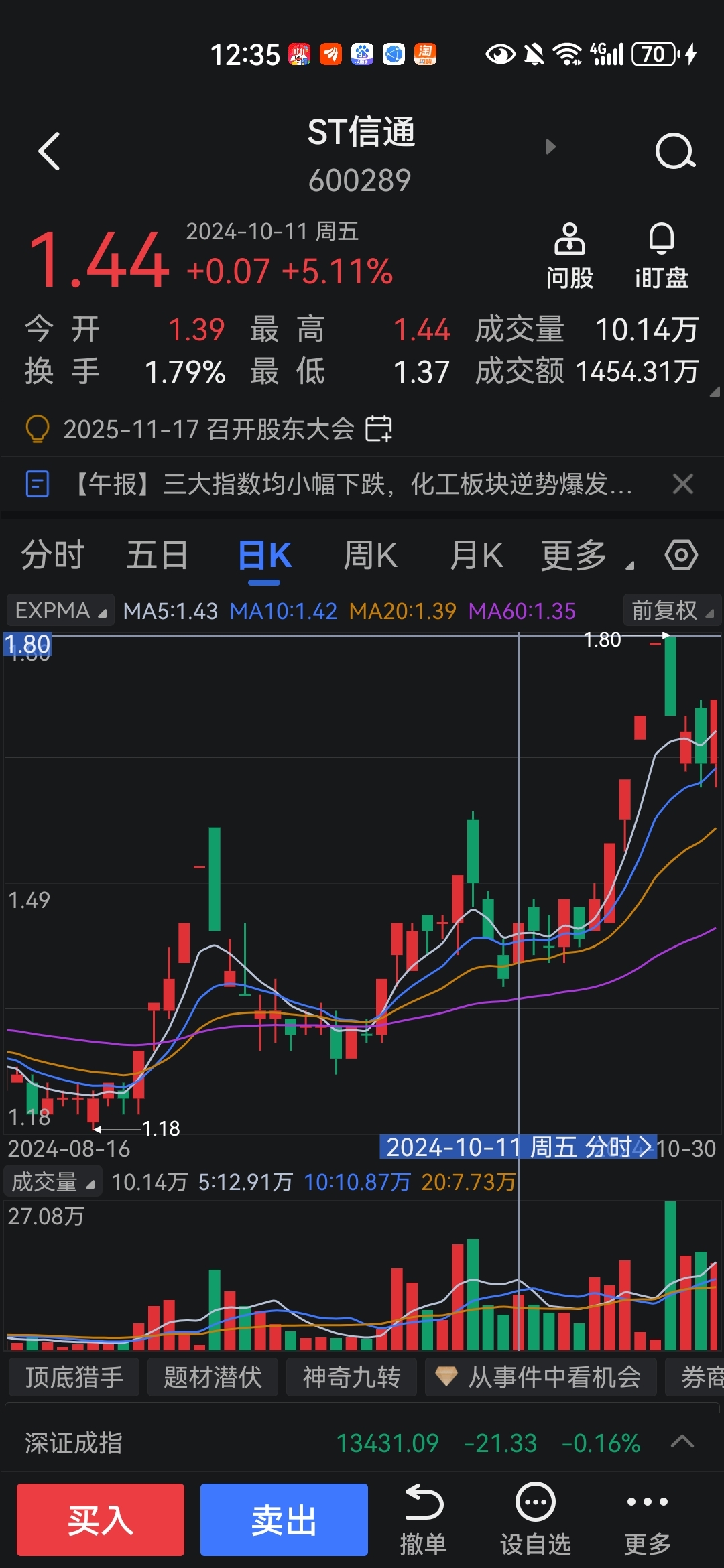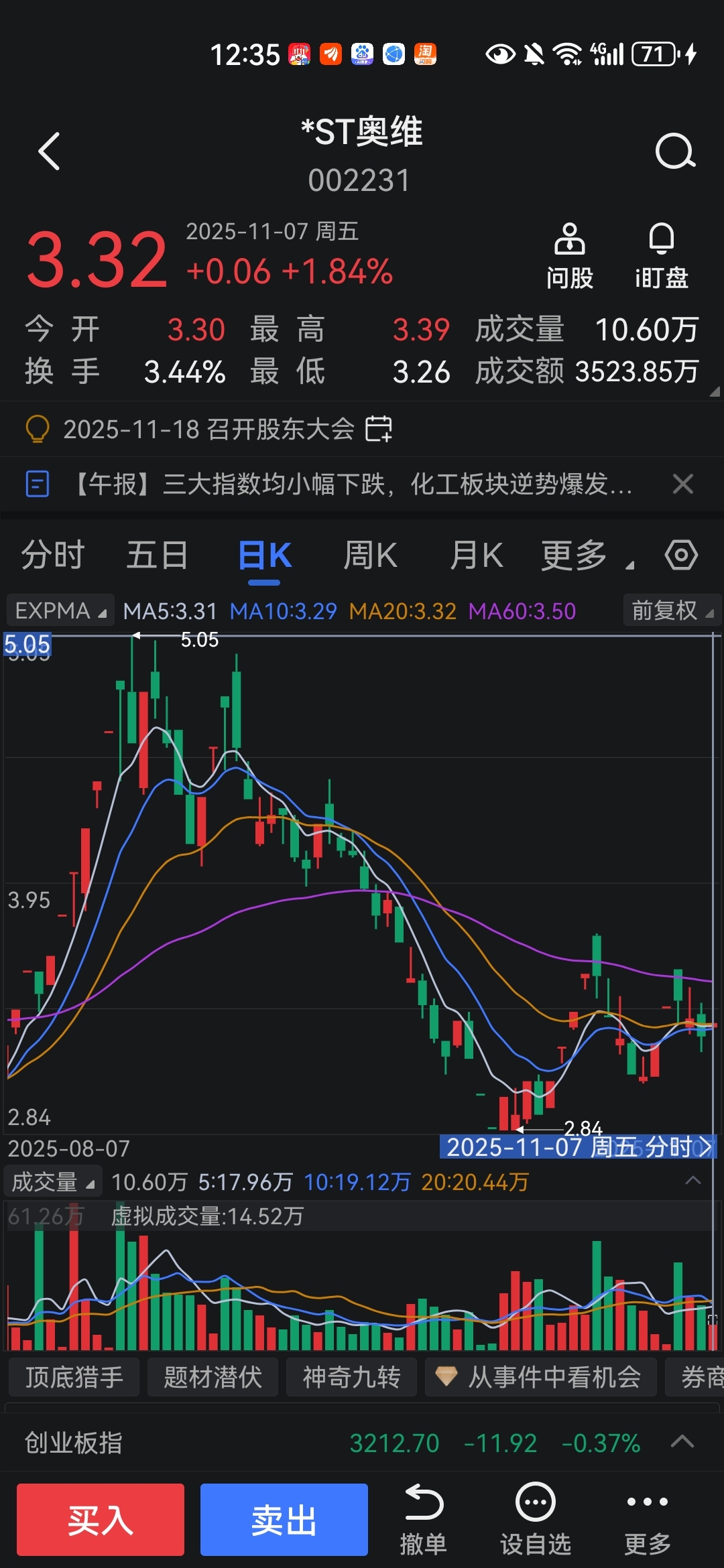 对比同样资金违占的信通,从图形上看10月11号前3个交易都是调整的,奥维今天之前