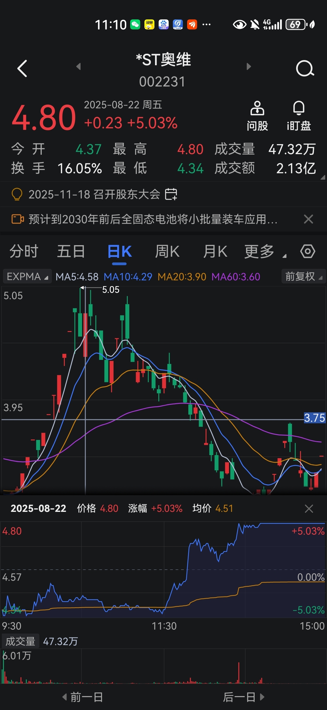 $*ST奥维(SZ002231)$ 奥维地天板的例子都有,今天上午维持平盘震荡,如果不强势早破了,我早上介入买点3.34了,主力不想让价格下去太多,因为昨天大资金量才拉到3.30这个平台,所以会做T的做T不会做T的就拿好,等不了洗盘的,也可以关注新元低吸的机会