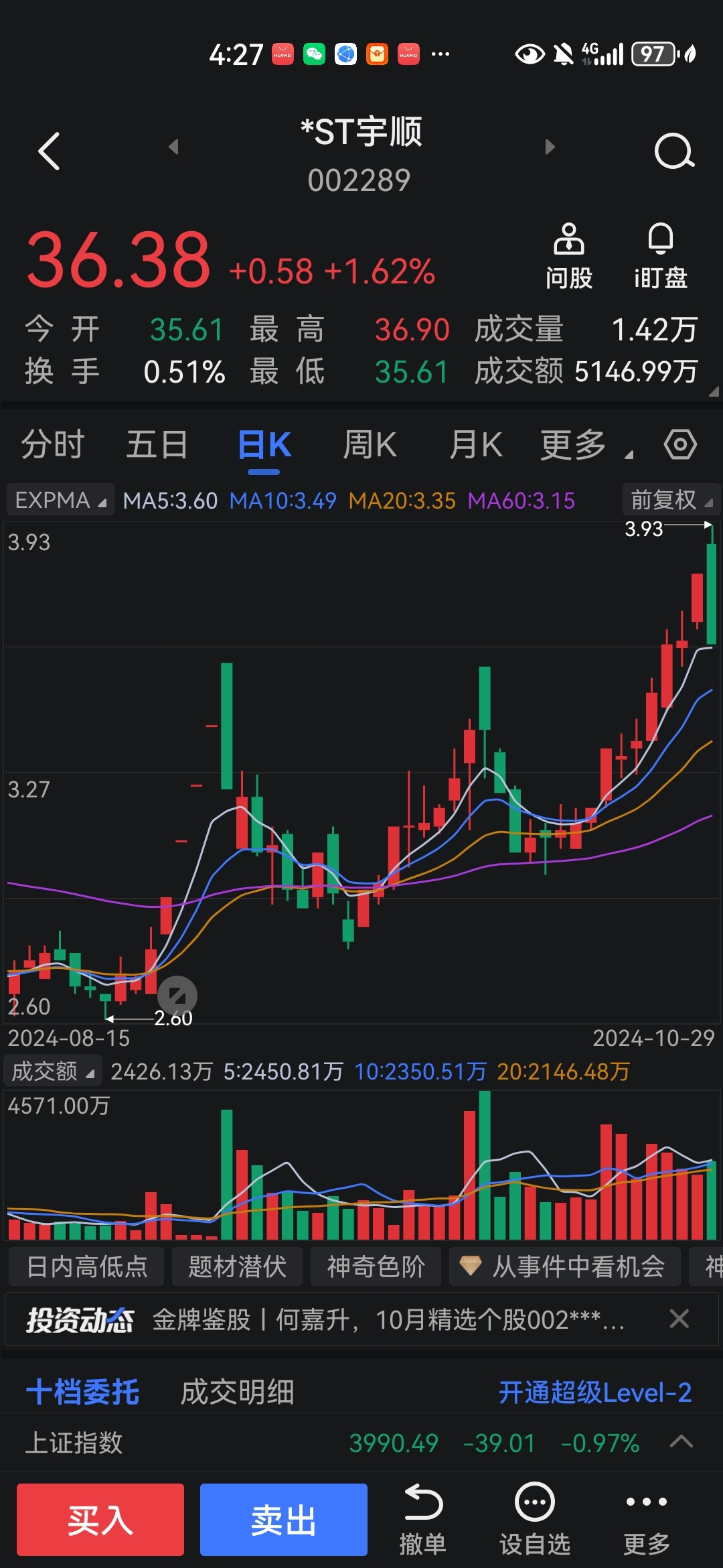 $*ST奥维(SZ002231)$ 不只奥维前期走势这样,宇顺和信通,前期走势大概图形也是这样,上去下来,再上去再下来,要判断准,那只能多看看一段时间,但是如果,这段时间上去了,好的介入点就不好找了,当然如果就认定奥维未来10倍股,那随时介入都可以