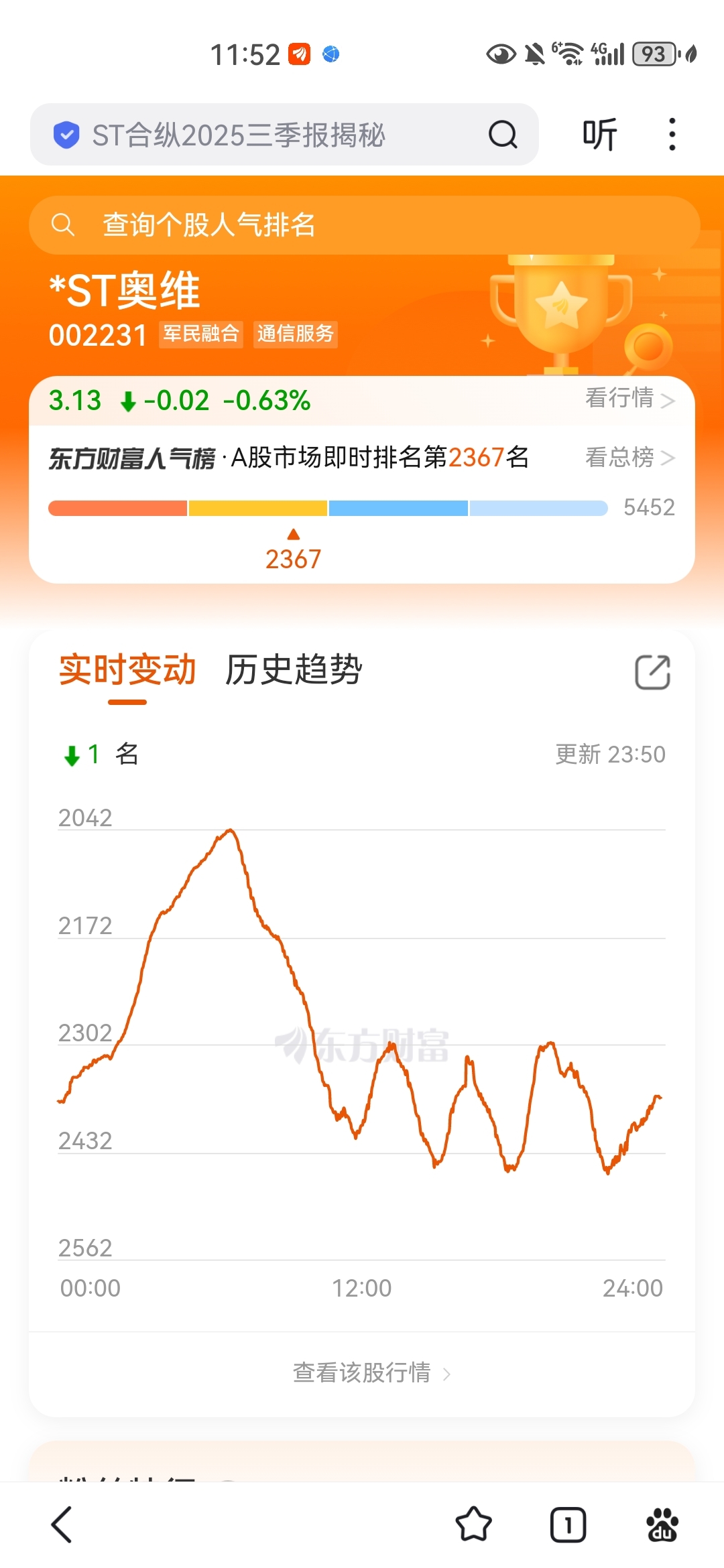 $*ST奥维(SZ002231)$ 对比了昨天一整天的奥维人气走势图,奥维股价从5.05到了2.84之后,上去下来,再上去再下来,再上去再下来,然后对照奥维人气走势,又要再上去,这次再上去,希望就别再下来了,中国有句话叫,事不过三,外面老搞事情,明年正是需要奥维原来主营设备的时候,能抗过明年十月份,奥维又能参与招标了,一切就都恢复正常了