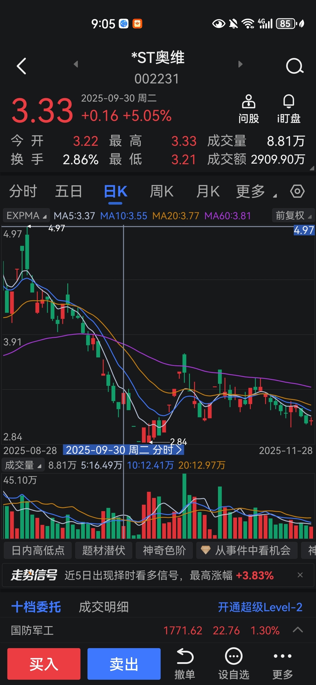 $*ST奥维(SZ002231)$ 复盘对比发现奥维启动以来,两次涨停间隔最长没有超过12个交易日,自从11月12号涨停以来已经间隔12个交易日没有涨停了,那下周一应该有一个涨停,下周一看看新发现的这个规律怎么样