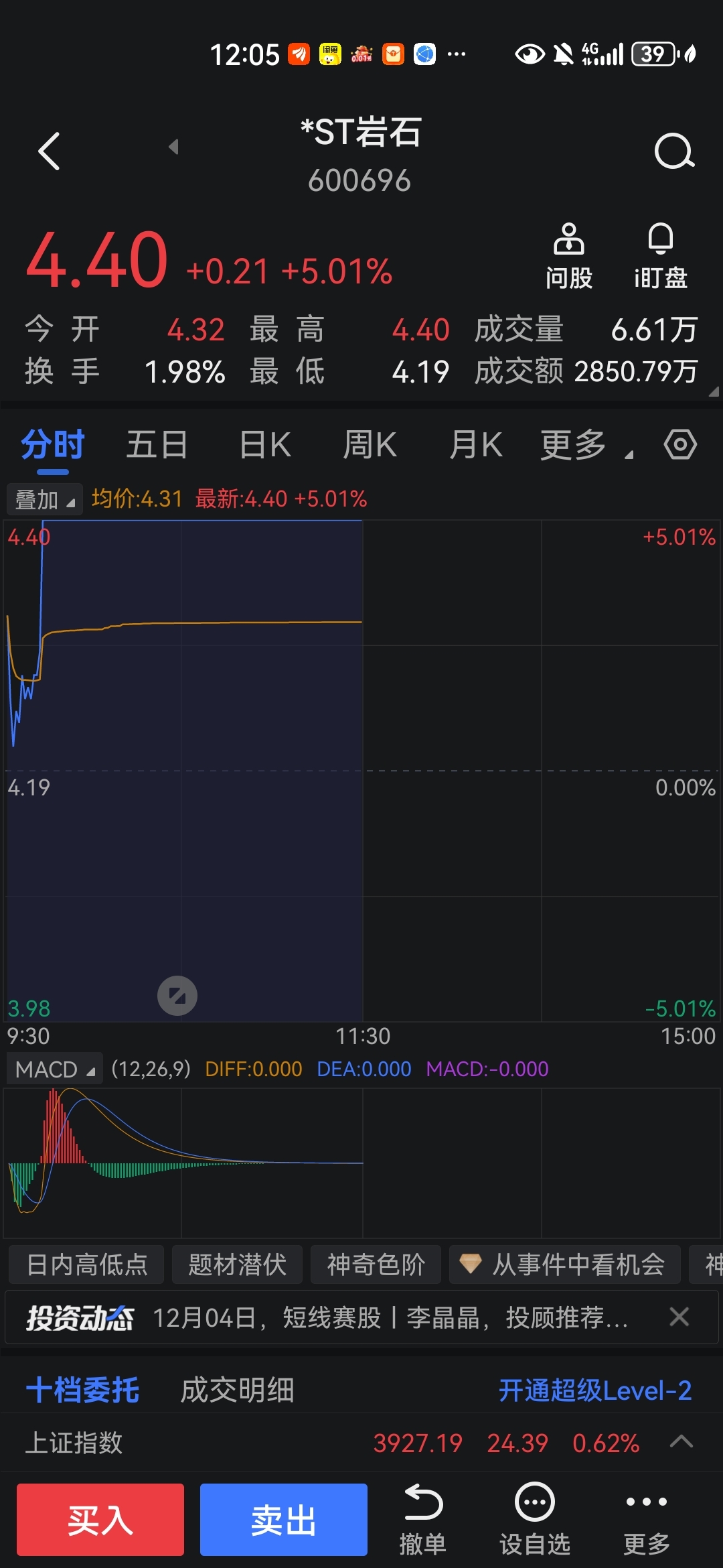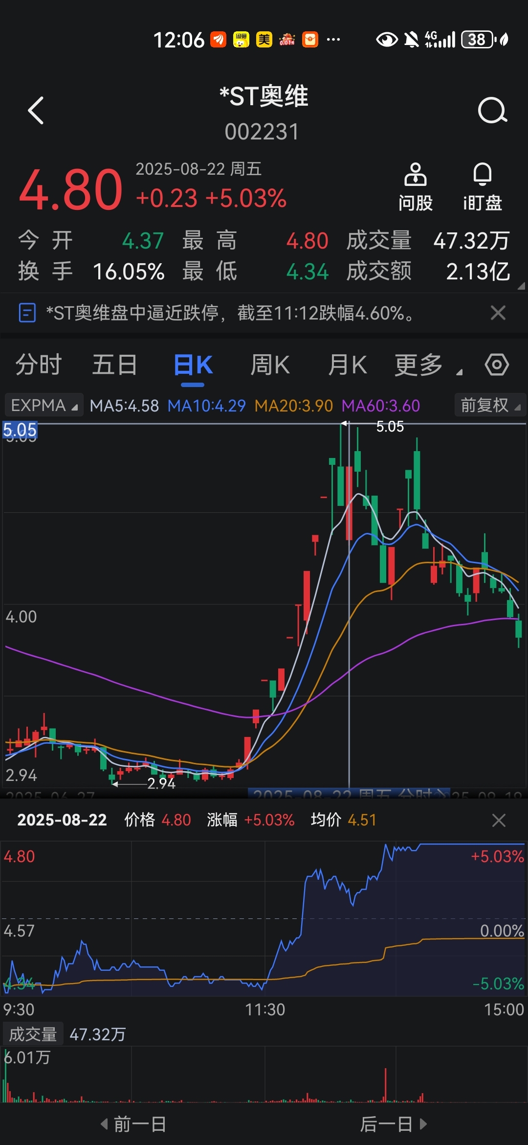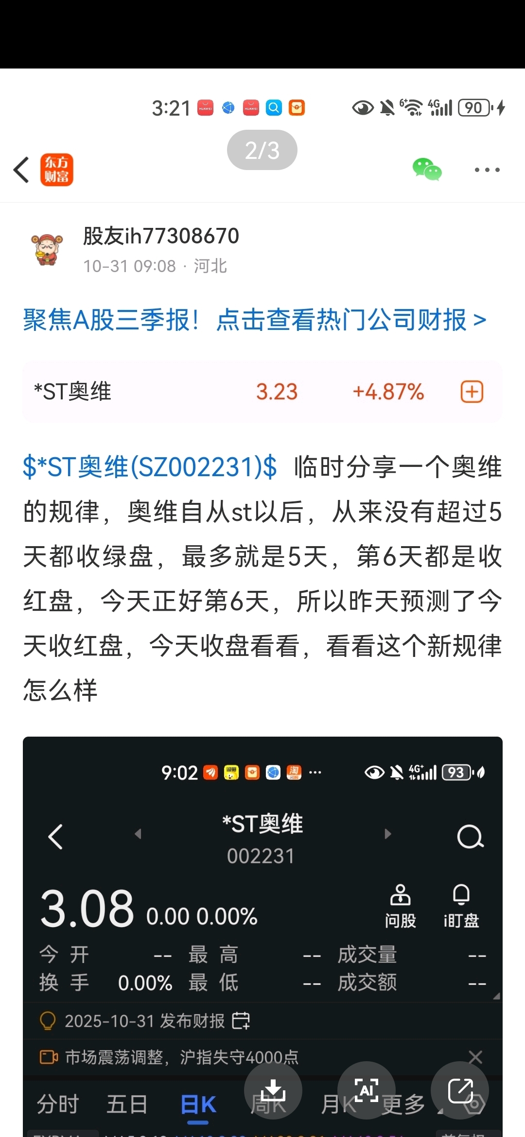 $*ST奥维(SZ002231)$ 本来3元走势规律破了,就不来这发帖了,但是看到今天奥维还没有跌停,也可能有机会就再发一次吧,奥维已经连续5天收绿盘了,今天是第六天如果能收红盘的话,这个规律就没破,今天大盘也可以,同样超跌的岩石已经涨停了,奥维又有过地天板的情况看看下午吧