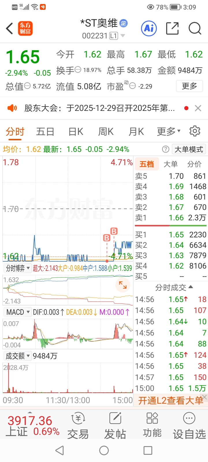 $*ST奥维(SZ002231)$ 唉终于良心发现不跌停板了。