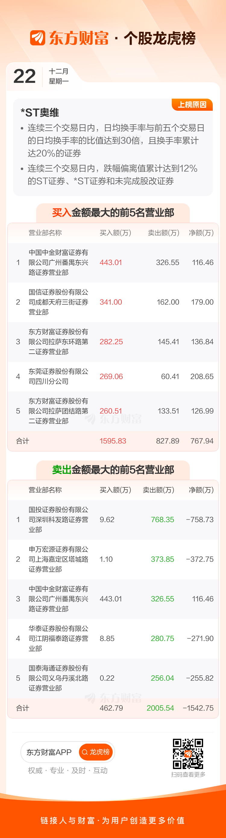 交易所2025年12月22日公布的交易公开信息显示,*ST奥维因成为连续三个交易日内,日均换手率与前五个交易日的日均换手率的比值达到30倍,且换手率累计达20%的证券、连续三个交易日内,跌幅偏离值累计达到12%的ST证券、*ST证券和未完成股改证券上榜。*ST奥维当日收报1.65元,涨跌幅-2.94%,换手率18.97%,成交额9483.98万。异常期间12月18日至12月22日,期间涨幅-12.23%,累计偏离值35.06%,区间成交额1.84亿。异常期间12月18日至12月22日,期间涨幅-12.23%,累计偏离值-13.64%,区间成交额1.84亿。