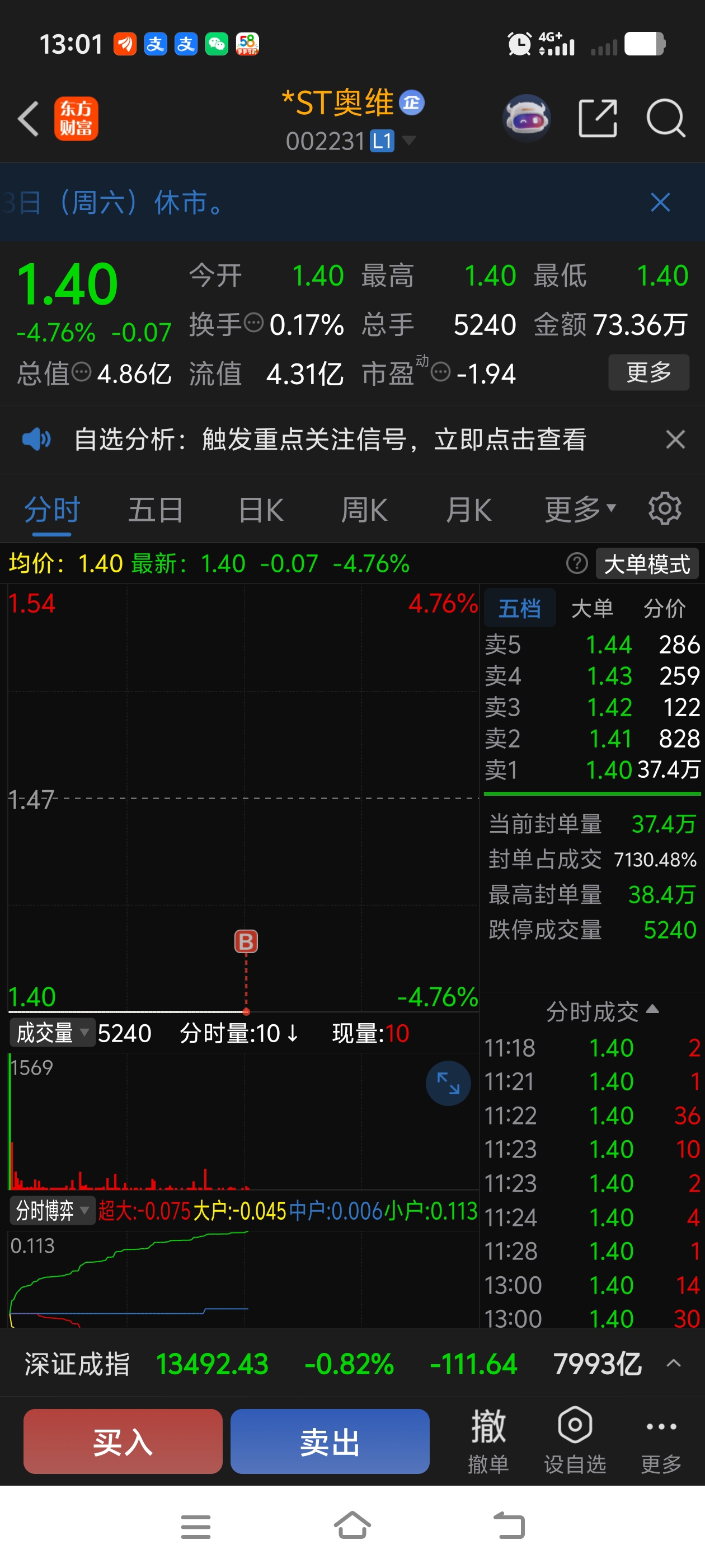 $*ST奥维(SZ002231)$ 钱到账马上买入了
