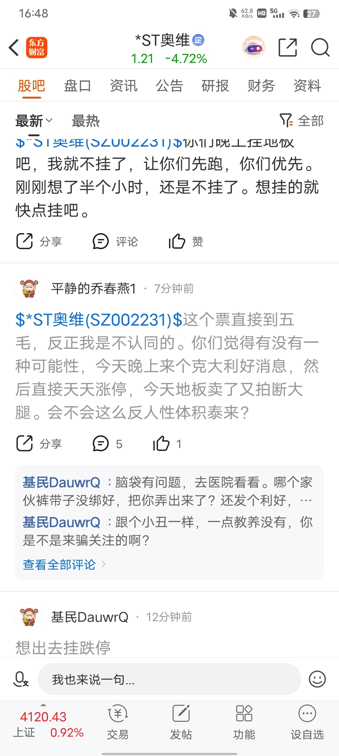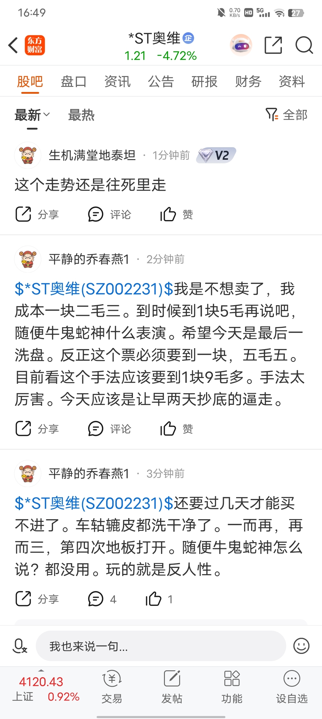 $*ST奥维(SZ002231)$ 兄弟们,小心这个人是骗子啊。他是专门骗关注的。一会儿说股票卖了,一会儿说他是不会卖出的1.5在卖,你说这种人是干什么的?直接拉黑这个人就行了。一会儿卖出股票,一会儿没有卖出股票的,他到底卖没卖出啊?