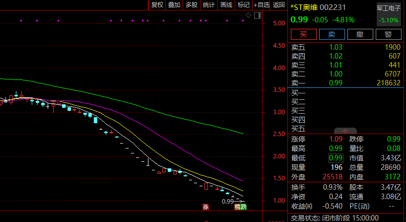 1月15日,*ST奥维(002231)再度呈现出跌停走势,全天收于0.99元,下跌0.05元,跌幅为4.81%。