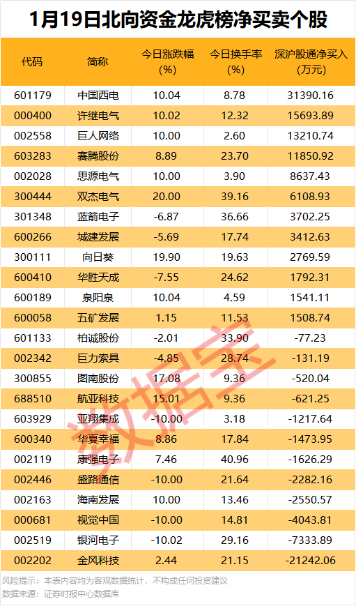 今日龙虎榜现身个股中,12股获北向资金净买入。净买入居首的是中国西电,金额为3.14亿元;许继电气、巨人网络、赛腾股份等紧随其后,净买入金额均超1亿元。