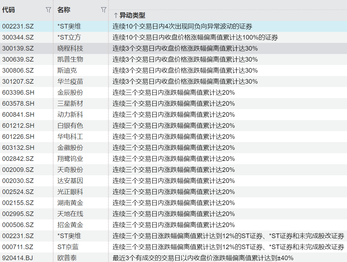 金辰股份、三星新材、动力新科等连续三个交易日内涨跌幅偏离值累计达20%。