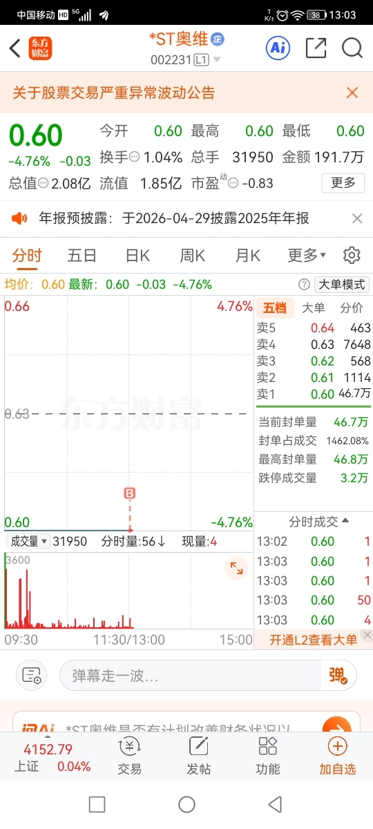 $*ST奥维(SZ002231)$ 过来抄底一手,买个门票,到时新三板加仓搞起来,来个价值投资三年,长线可为