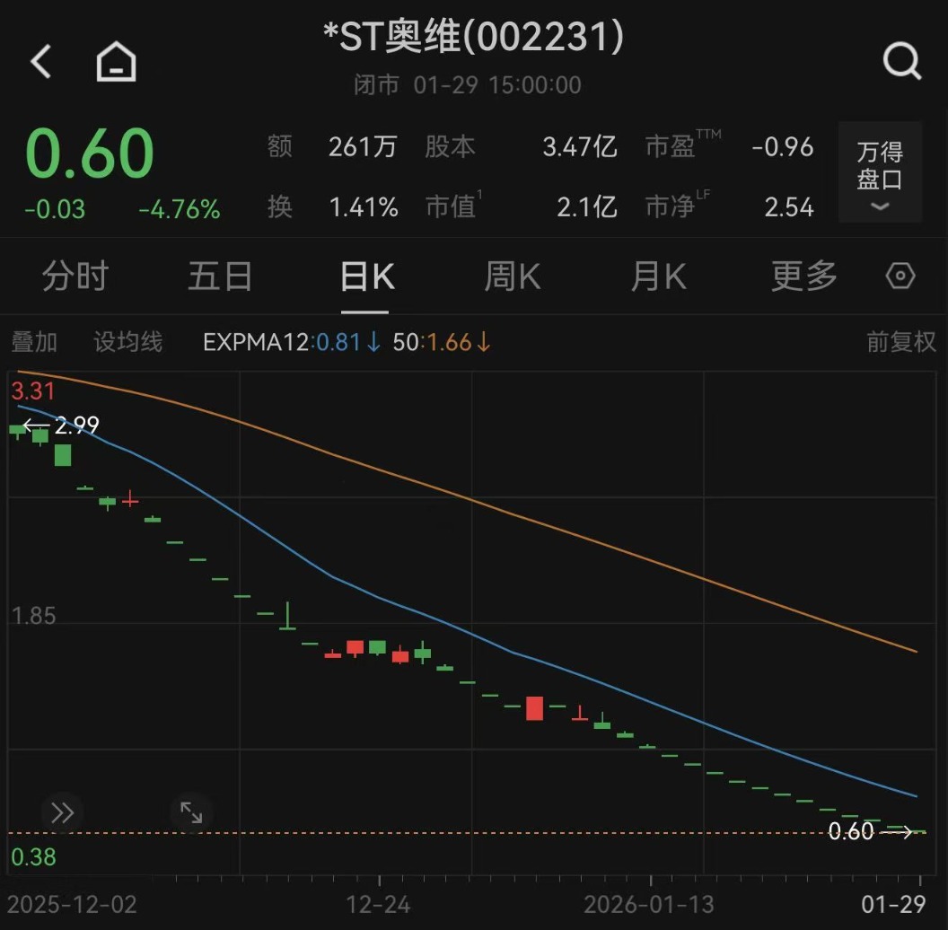 此外,截至2026年1月29日收盘,*ST奥维已连续11个交易日收盘价低于1元/股。