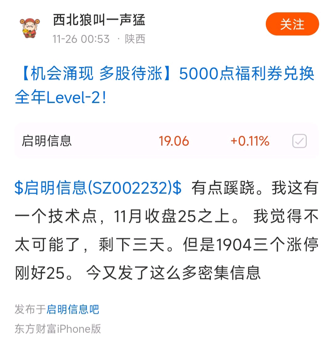 $启明信息(SZ002232)$ 有人说月底会站上25(看下图截图),你相信吗?