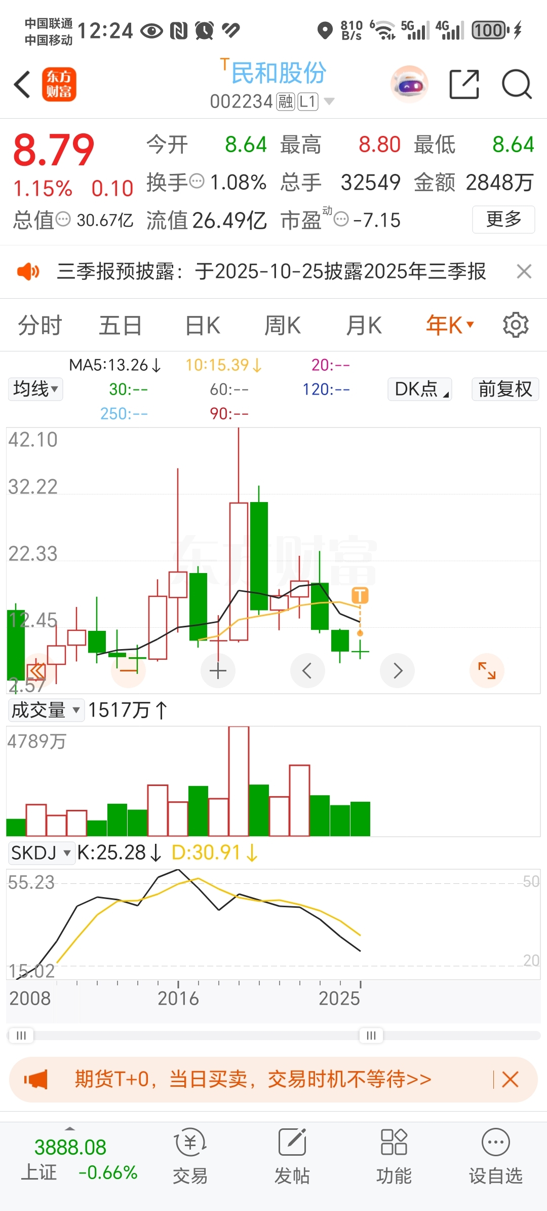 $民和股份(SZ002234)$ 前边两次年线收十字星,后边一两年都是翻倍的上涨,希望今年年线也是收十字星,明年后年鸡周期叠加经济复苏通货膨胀,翻几倍,让我买个小电驴