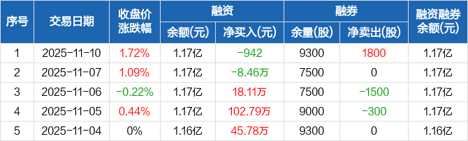 融资方面,当日融资买入550.82万元,融资偿还550.91万元,融资净偿还942元。融券方面,融券卖出1800股,融券偿还0股,融券余量9300股,融券余额8.78万元。融资融券余额合计1.17亿元。
