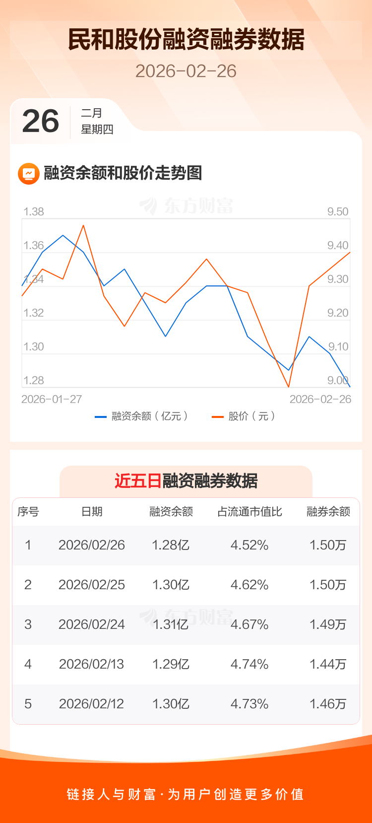 交易所最新数据显示,民和股份于2026年2月26日获融资买入295.89万元,融资偿还500.80万元,当日融资净偿还204.91万元。目前,该股融资余额1.28亿,占流通市值比例为4.52%。
