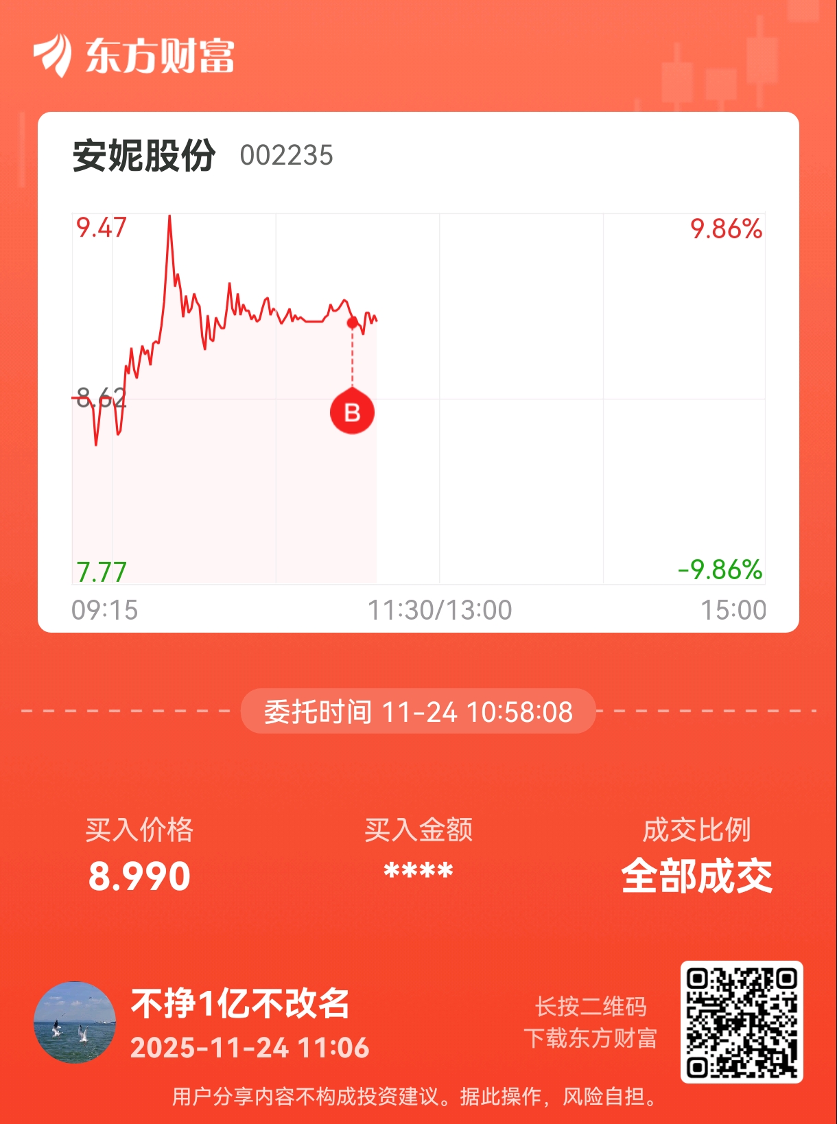 $安妮股份(SZ002235)$ 挑战挣一个亿,跟买风险自担噢,没有人百分百胜,鱼已卖!买它涨涨涨