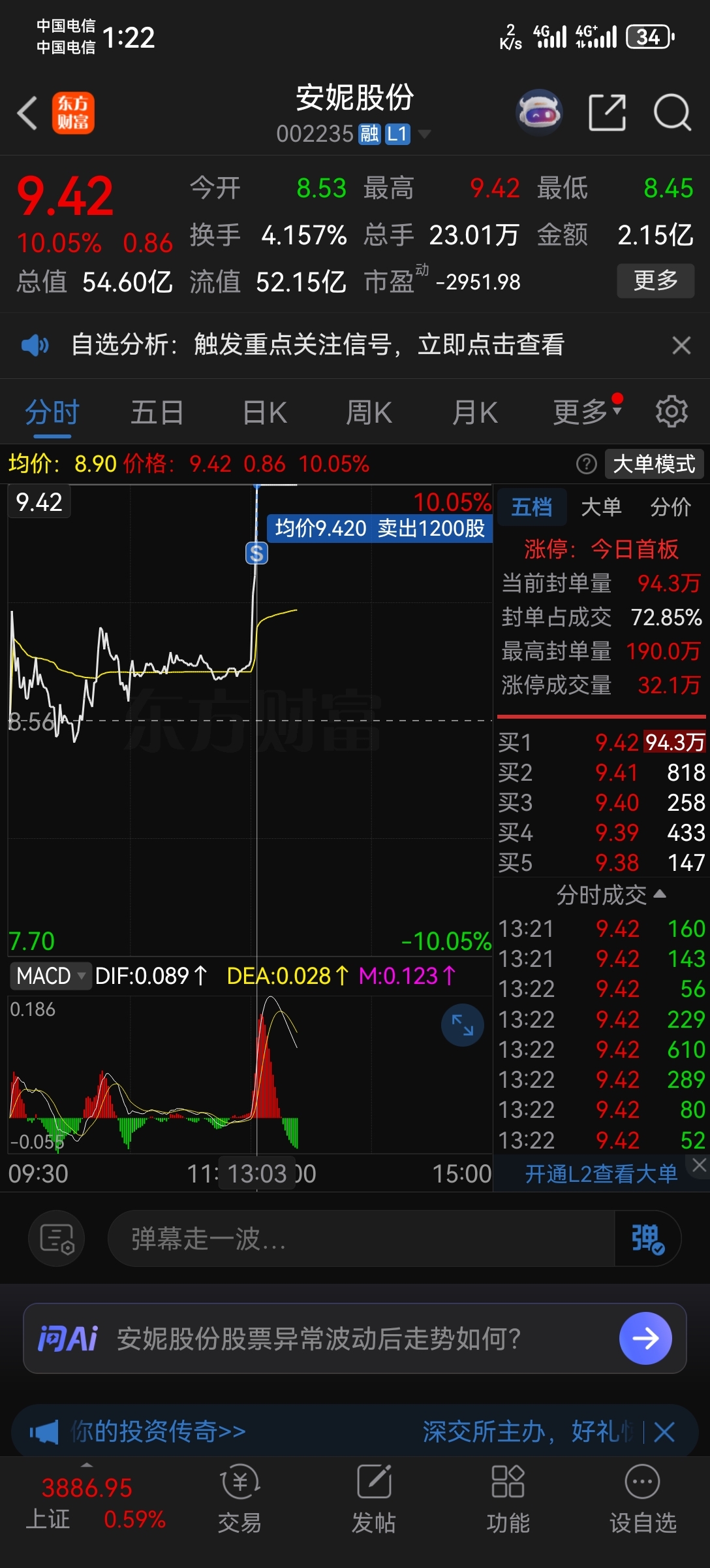 $安妮股份(SZ002235)$ 早晨挂的涨停,中午午休睡过时间了。有点可怕