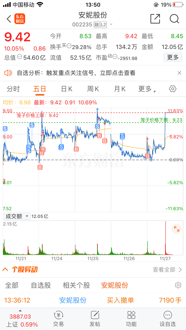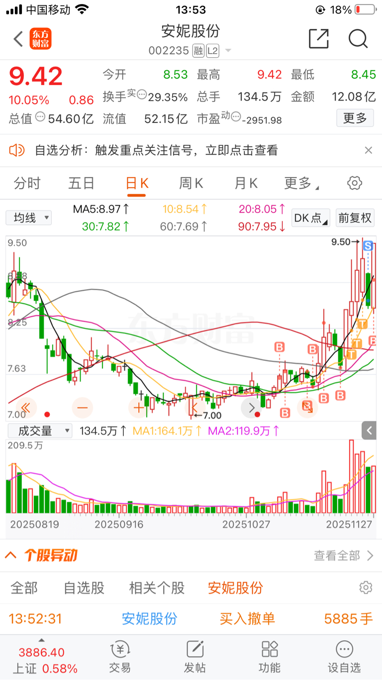 $安妮股份(SZ002235)$ 连续四天宽幅振荡洗筹,昨天暴力砸盘跌破5日均线卖出,今日站稳10日线,上穿5日线买回,上一次被人民同泰主力用此手法甩下车这次多留了一个心眼关注安妮防止主力回马枪,这次能复刻人民同泰一波吗?