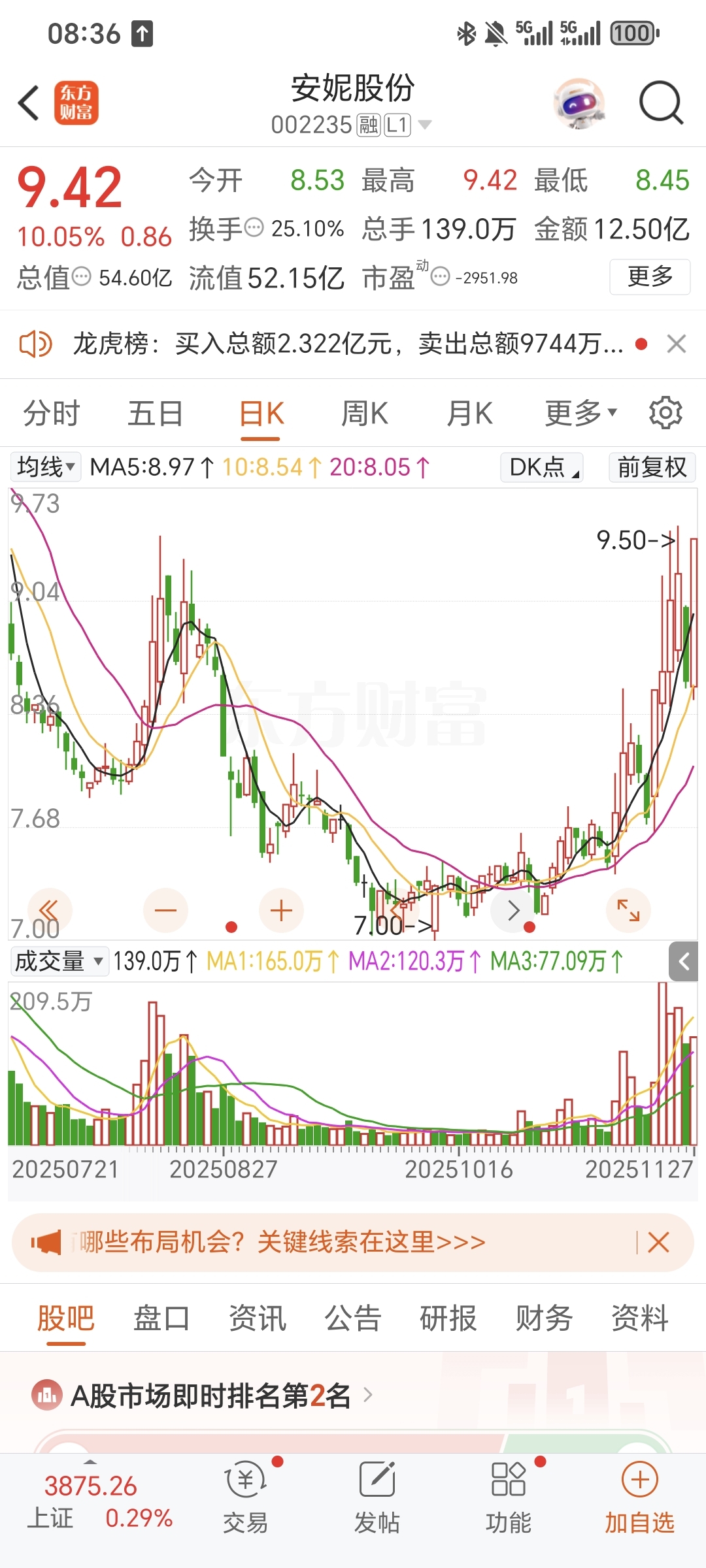 $安妮股份(SZ002235)$ 今天安妮股份直接封死10.05%涨停,现价9.42精准踩在日内最高点,从开盘8.53一路突突突,最低点才8.45,基本是高开高走的强势节奏!