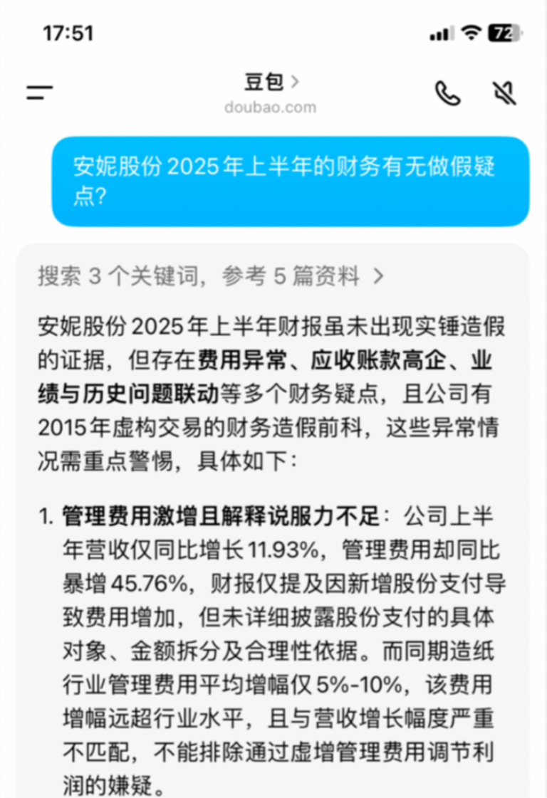 安妮股份2025年上半年财报虽未出现实锤造假的证据,但存在费用异常、应收账款高企、业绩与历史问题联动等多个财务疑点,且公司有2015年虚构交易的财务造假前科,这些异常情况需重点警惕,具体如下: