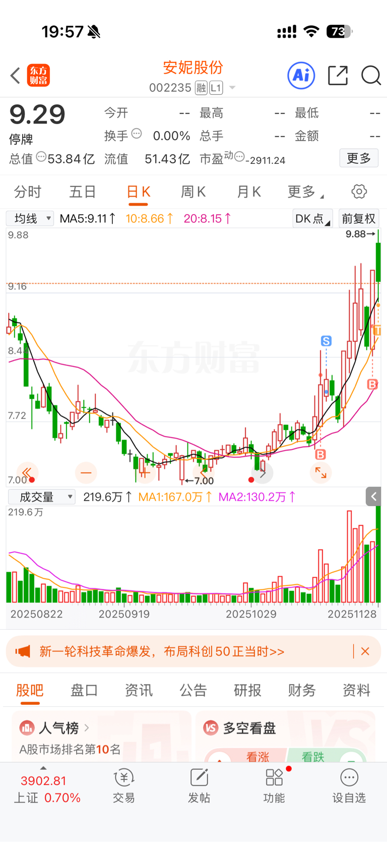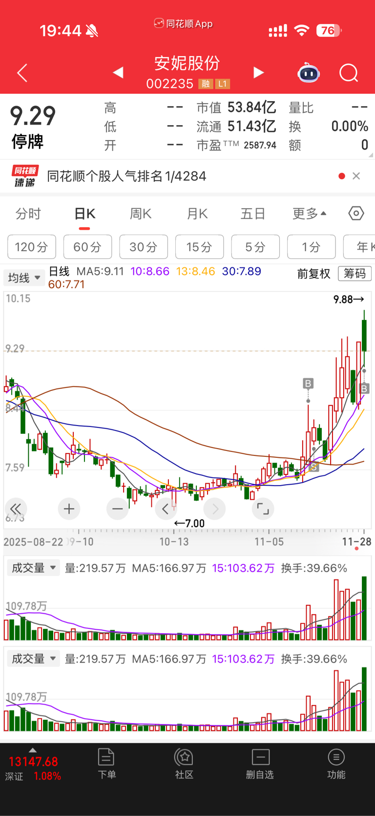 $安妮股份(SZ002235)$ 两个账号都买了 可以吃十五个板?
