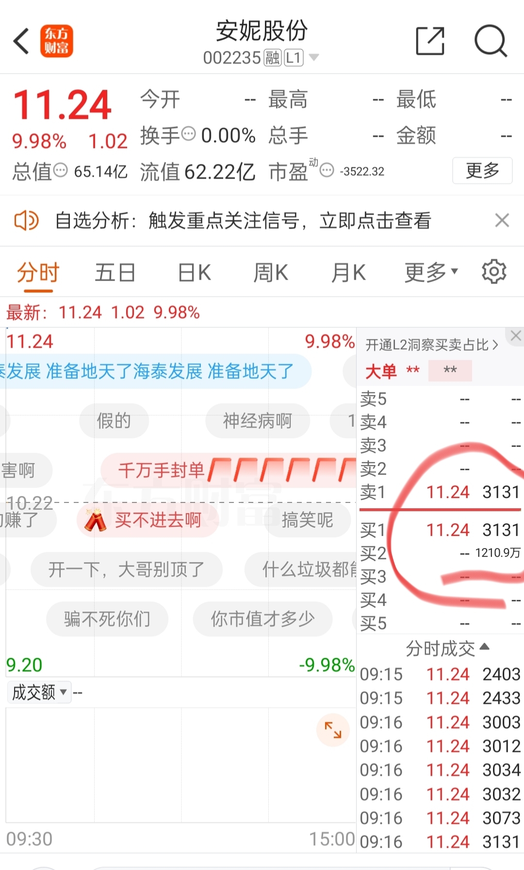$安妮股份(SZ002235)$ 集合竞价又是100多个亿挂涨停,就看谁幸运隔夜挂单挂的快