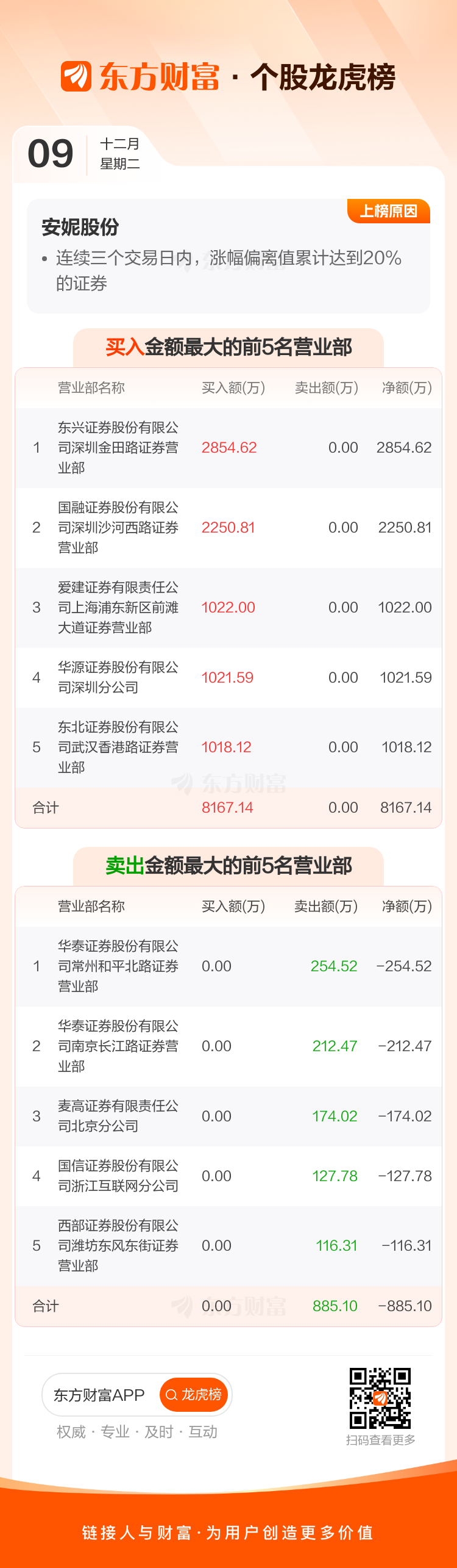 交易所2025年12月9日公布的交易公开信息显示,安妮股份因成为连续三个交易日内,涨幅偏离值累计达到20%的证券上榜。安妮股份当日收报11.24元,涨跌幅9.98%,换手率0.59%,成交额3644.96万。异常期间12月8日至12月9日,期间涨幅20.99%,累计偏离值20.30%,区间成交额1.07亿。