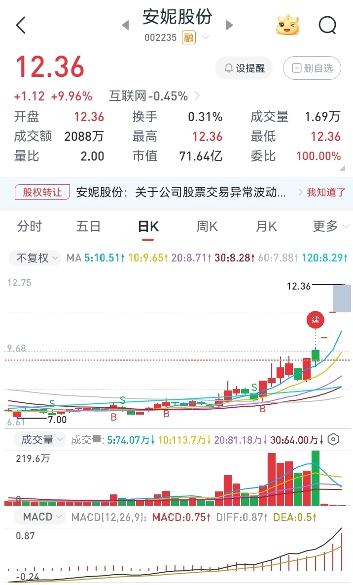 $安妮股份(SZ002235)$ 7个板就翻一倍,加油!