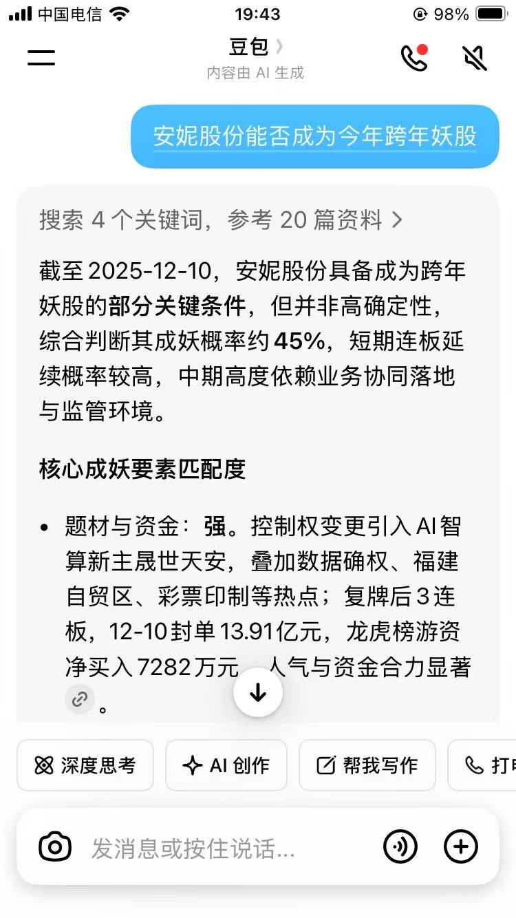 $安妮股份(SZ002235)$ 安妮历史上经常作妖,加上盘子小价格低,海峡两岸福建板块,加上这次买方晟世天安的背景想象空间无限,且不知是特意还是偶然刚好卡在这个天时地利人和的黄金时间点,怎么看都是不二的跨年妖股,不过豆包确只给出45%左右的概率